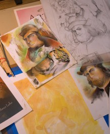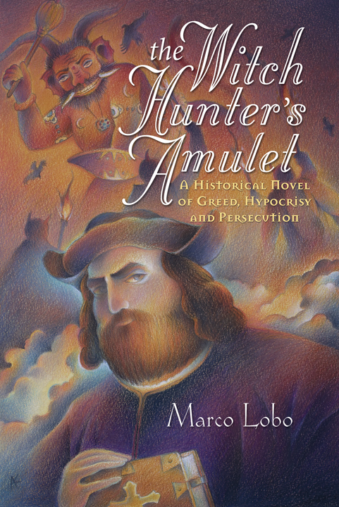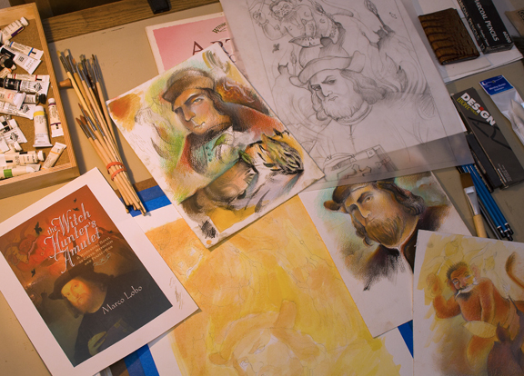 Book cover illustration & design for this cover took much research to achieve the authentic feel of the 1500’s era of Inquistions and convey the rich cultural and spiritual tapestry that was India then and still is. Below you will see a snapshot of my drafting table with some test illustrations to warm up with as well as references. Each page of this book is a visual and sensory delight, you won’t regret reading its pages, you can get your copy at <a title=”The Witch Hunter’s Amulet” href=”http://christophermatthewspub.com/?page_id=3601″ target=”_blank”>Christopher Matthews Publishing</a>.<!–more–> Goa, India—16th Century. With the Inquisition extended to Portugal’s overseas territories, Manuel Andrade is sent by the Catholic Church to Goa, India, to arrest witches—the consorts of Satan. In 1564 he arrives in India— deathly ill, he is convinced that in order to recover, he needs to assemble a jeweled amulet. Andrade is ill-prepared to deal with the intricacies of life and the culture in India. The country is on the brink of war between the Hindu Vijayanagar Empire and the Muslim Sultans of the Deccan Plateau. The Portuguese, ever-hungry for territorial expansion and for more Catholic converts, add fuel to the fire, bringing the cauldron to its boiling point. Based on both real and fictional events and characters this novel graphically explores the terrible themes of hypocrisy, persecution and torture that characterized this period. Rich in lush detail, <strong><em>The Witch Hunter’s Amulet</em></strong> allows the reader’s senses to experience the exotic smells, sights and vivid colors of 16th century India.